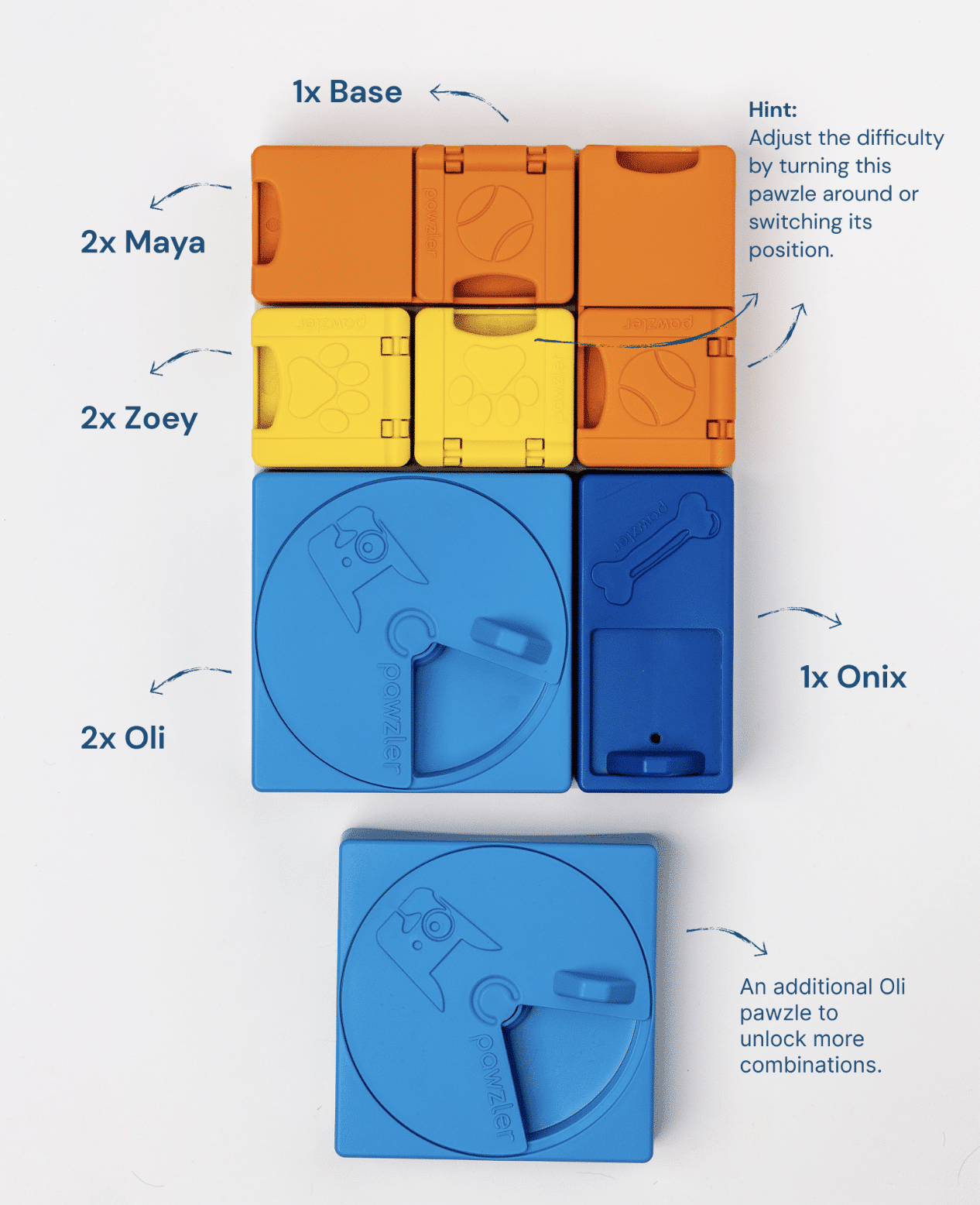 L’ensemble Rainbow est un casse-tête pour chien qui divertira votre chien pendant qu’il utilisera ses compétences de chasse naturelles pour trouver des friandises cachées. L’ensemble comprend des mécanismes de dissimulation de friandises qui nécessitent de pousser le couvercle, de le soulever, de le tirer et de le tourner. Chaque ensemble comprend au moins une base qui contient des pattes individuelles.